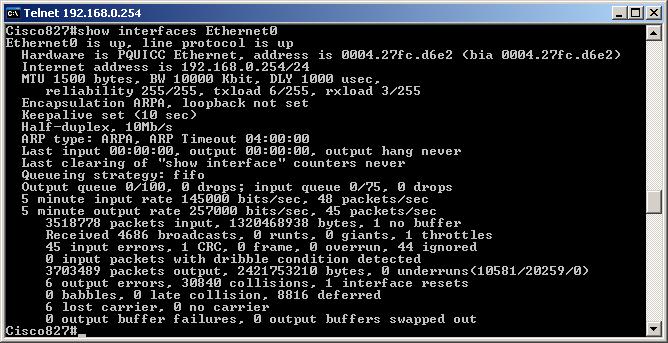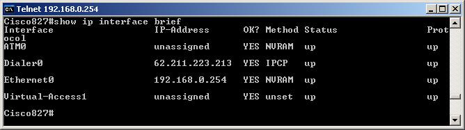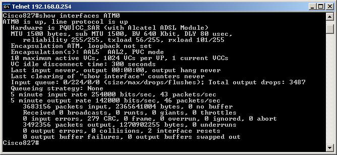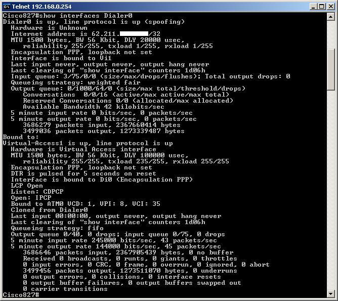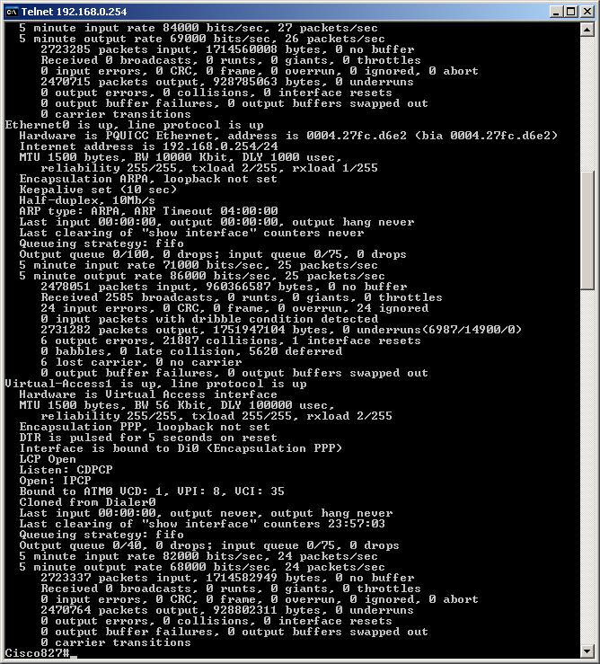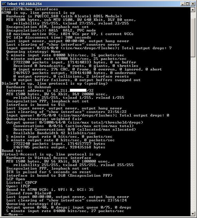 E' possibile visualizzare le stesse informazioni del comando precedente ma in modo separato per ogni tipo di interfaccia, attraverso i comandi "show interfaces ATM0", "show interfaces Dialer0" e "show interfaces Ethernet0":