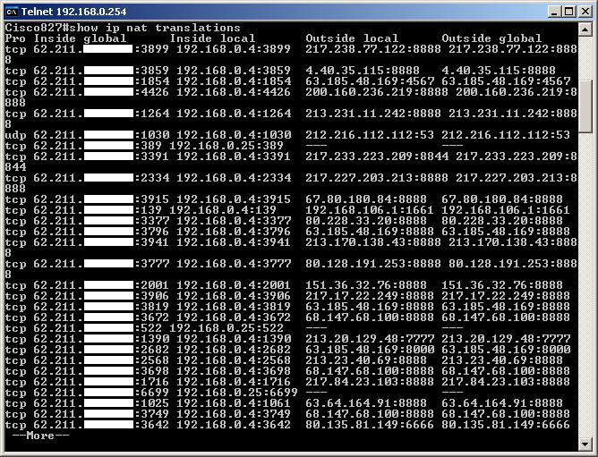 Attraverso il comando "show ip nat translations" possiamo visualizzare la treslezione degli indirizzi che effettua il router tra gli IP locali e l'unico IP pubblico esterno con le relative porte di utilizzo: